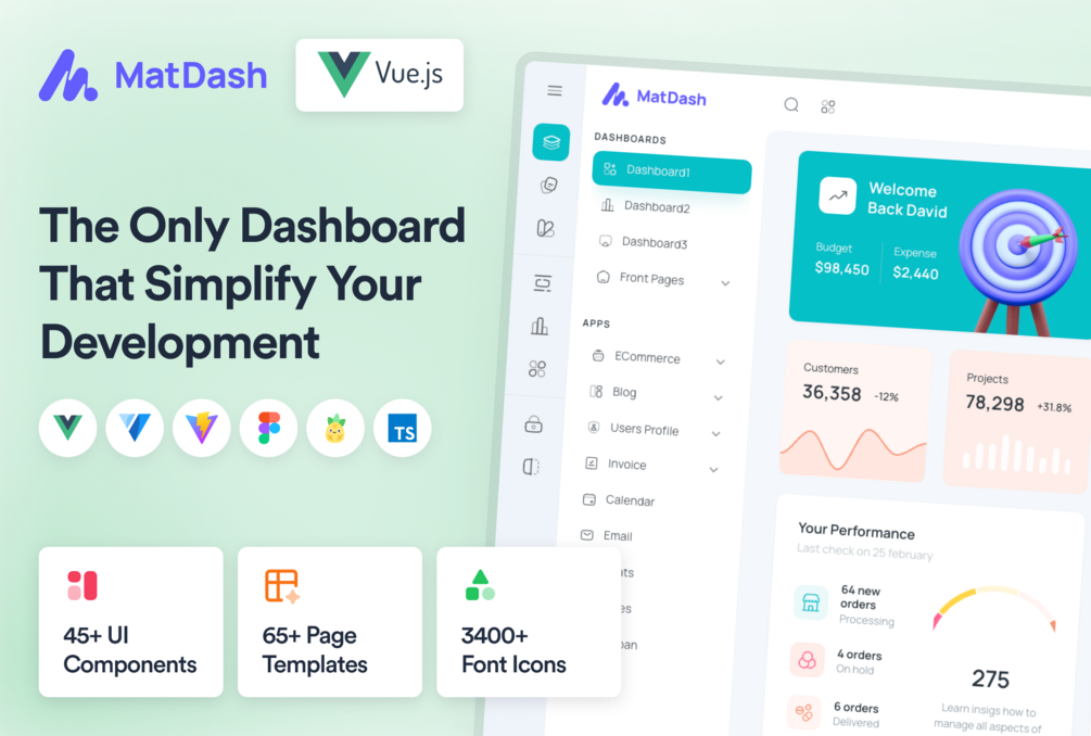 Matdash Vuejs Admin Dashboard is a meticulously designed, feature-rich admin template built to simplify the development of modern web applications. It utilizes cutting-edge technologies like Vue.js, Vuetify, Vite.js, and TypeScript and offers exceptional performance, scalability, and efficiency for developers.