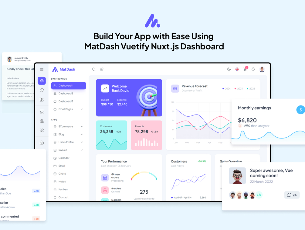 Checkout Live PreviewMatDash is a user-friendly admin dashboard template that combines Vuetify's design framework with Nuxt.js's powerful features. It's designed to help developers create modern, responsive web applications quickly and efficiently.