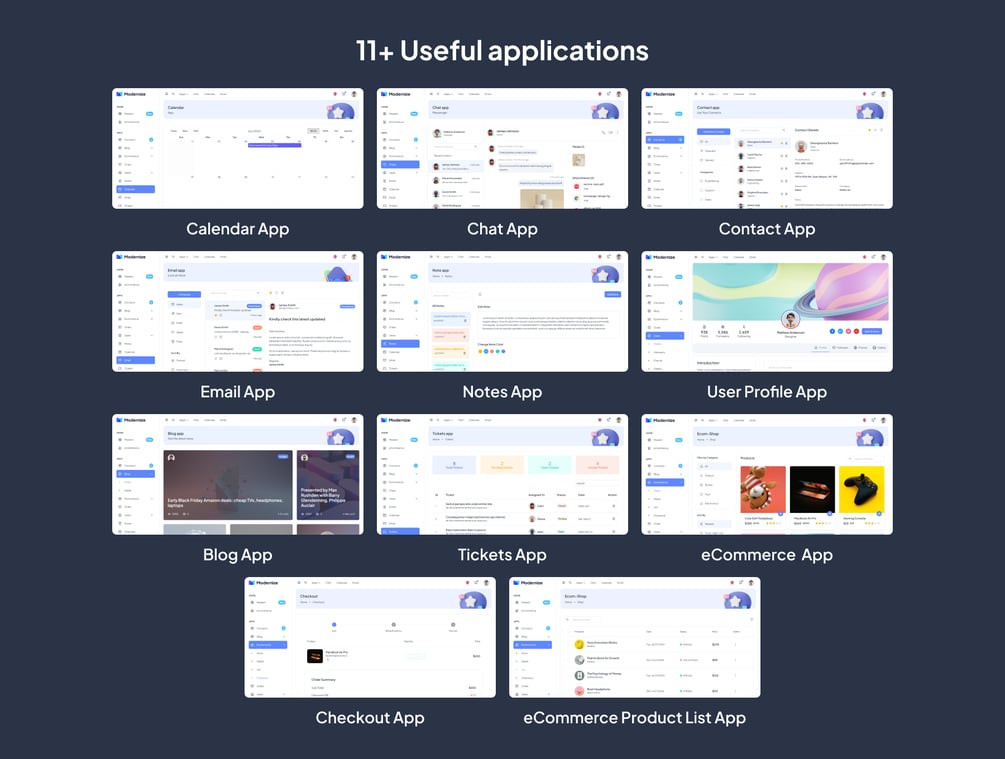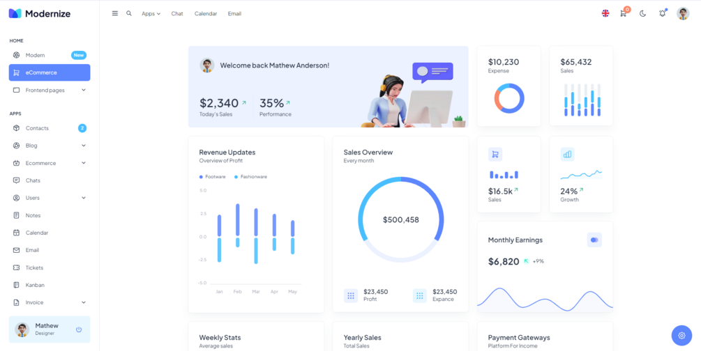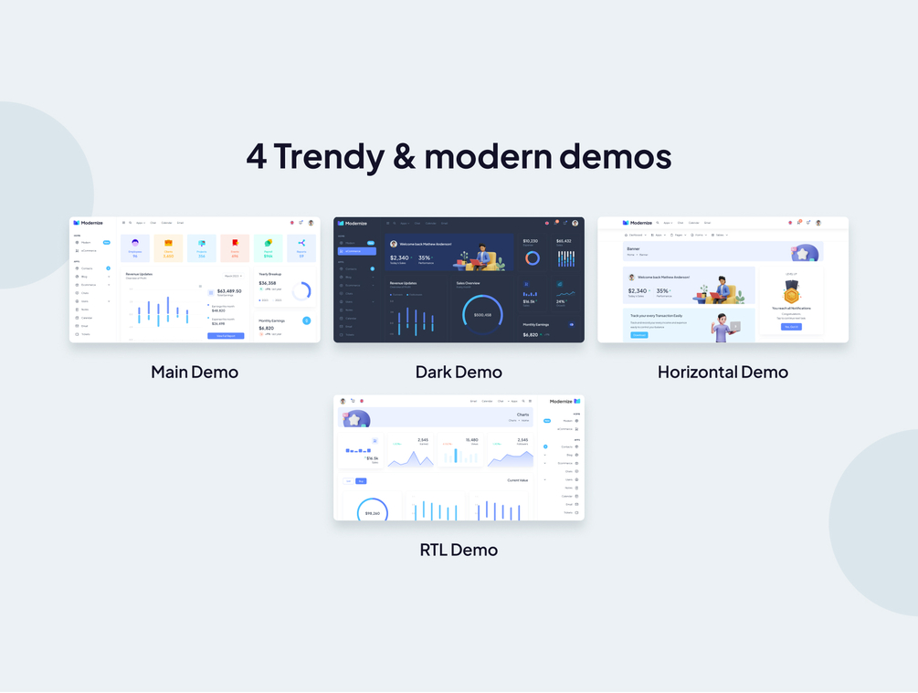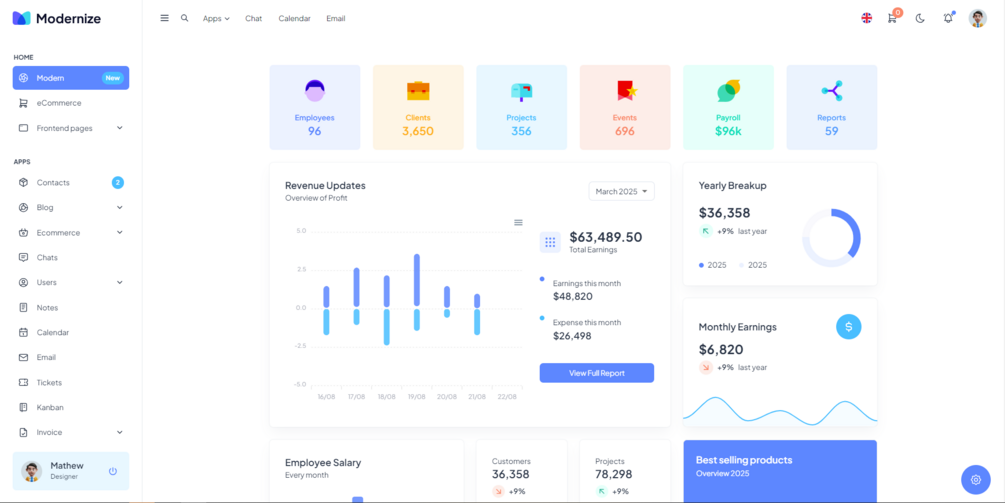 Equipped with light and dark themes, extensive chart libraries, and advanced form elements, Modernize also supports real-time data updates, authentication modules, and API integration. Whether you’re managing data-heavy projects or multi-user platforms, this admin dashboard guarantees top-notch performance and flexibility.